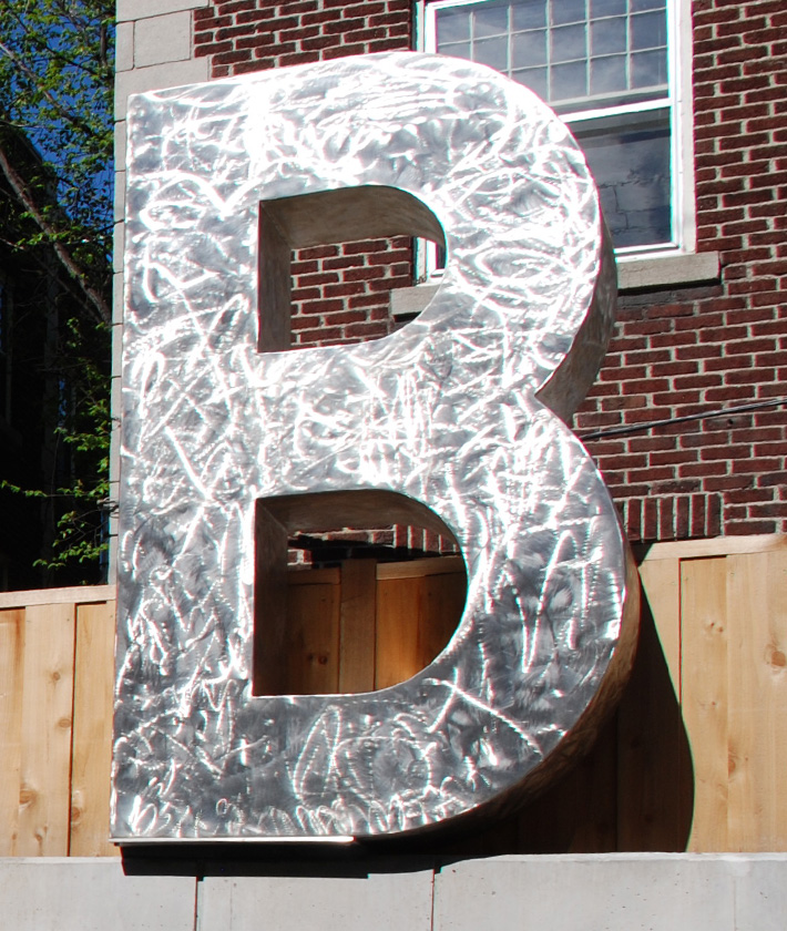 Running along Hennepin Avenue, these seven-foot brushed stainless steel letters became the most visible emblem of the previous Walker Library, opened in 1981, as its two main floors were built underground. Installed during a 1995 renovation to make the library more inviting, the letters were saved during the 2013 demolition to be relocated to the new library, opened in 2014. Now along the west side of the building and visible from reading loft windows, the letters welcome library visitors arriving by car, while pedestrians and cyclists on the nearby Midtown Greenway can sneak a peek from The Mall.