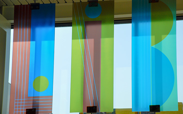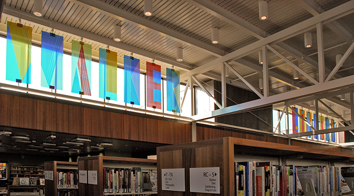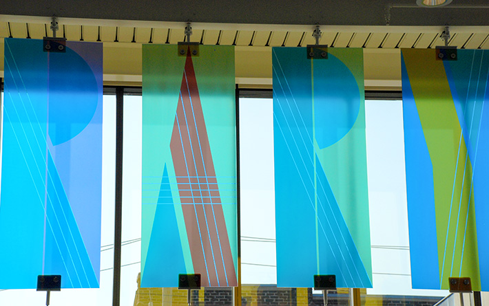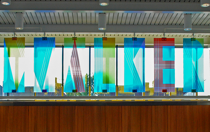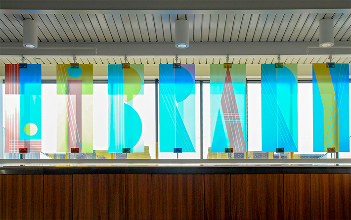 Fourteen panels, made of laminated tempered dichroic glass, form a memorable composition in front of the library’s clerestory windows. As a literal signifier, the panels spell out “WALKER” and “LIBRARY.” Each panel, 80 inches tall, uses gold and complementary colors to play off the warm interior wood tones and sits in custom metal brackets. The two installations, like bonded elements, visually join two parts of the building when standing at its center, drawing together the library collection and open gathering spaces that define Walker Library.