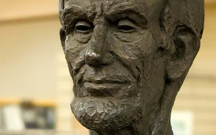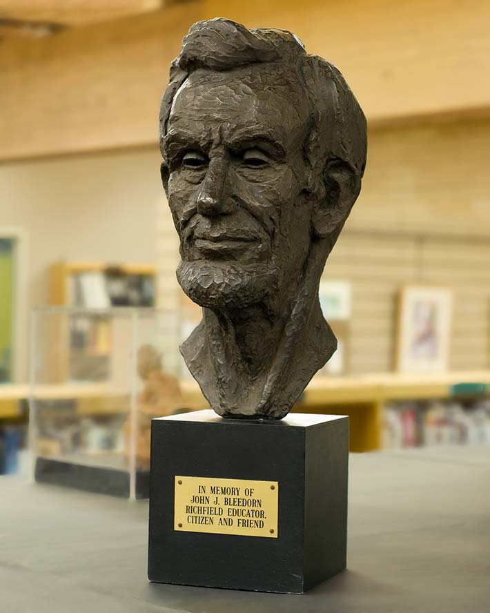 The backstory of this bust is as interesting as the piece itself, thanks to the storied pedigree of its creator. Sculptor Leo Cherne was not an artist first and foremost; he was an economist, attorney, humanitarian, public servant and advisor to nine U.S. presidents. In 1955, he created a bust of President Abraham Lincoln based on a photograph taken in 1865, just hours after the White House learned of General Robert E. Lee’s surrender and only four days before Lincoln was assassinated. (Lore has it that Lincoln was reciting the assassination lines from “Macbeth” while he sat for the photo.) The bust went on to become world-famous, with versions appearing in every White House from Eisenhower through Reagan. Replicas also spread across the world (often as gifts), with copies going as far as India, Africa, Guatemala, the officer quarters of the Abraham Lincoln submarine—and, of course, the Augsburg Park Library.