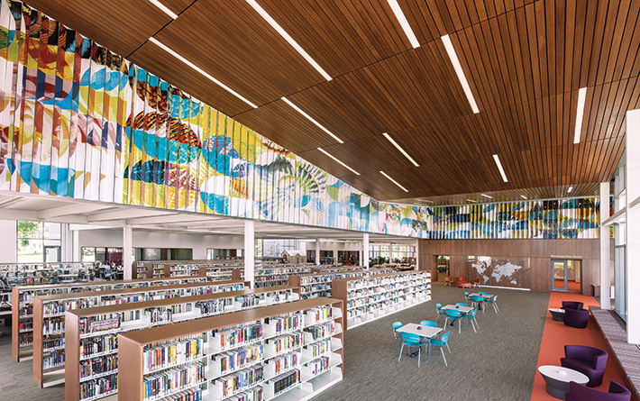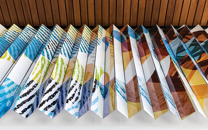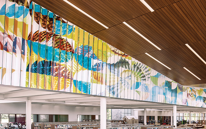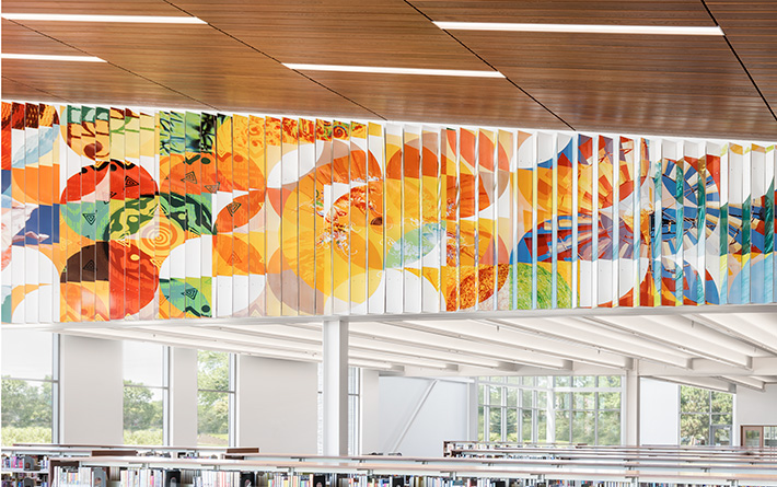 Folded ceramic steel panels lend a changing perspective to this wraparound wall mural, as the artwork shifts between two vibrant compositions. Visible from outside the library as well as inside, mural images reflect the STEM (science, technology, engineering, and math) theme envisioned for the library by the community. Standing from one angle, you see nature-themed imagery: potato blooms, snail shells, pinecones, snowflakes, and more. From the other, look for fingerprints, ancient fossils, weather patterns, and architecture. The artists were inspired by a spiral form built on the golden ratio, a shape underlying many patterns and shapes across the universe, including in the natural world, art, architecture, and design.