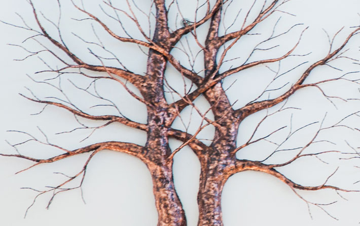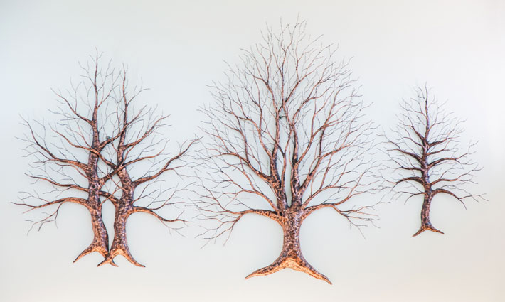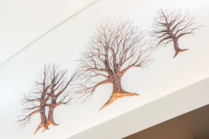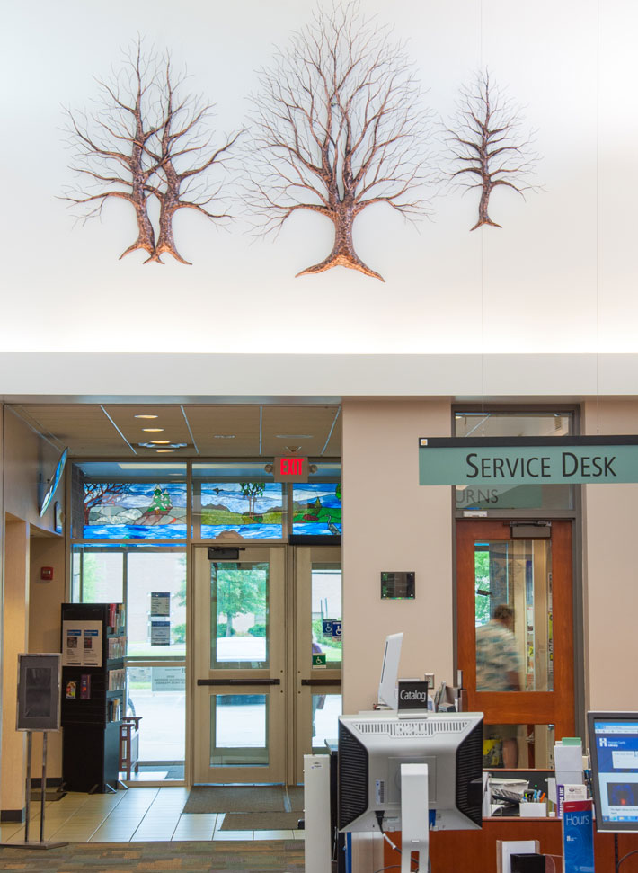 High on the walls of Champlin Library hang three copper trees, their bare branches reaching toward the sky. They’re the work of Fountain City artist John Lange, whose chosen medium is copper and chosen subject is nature: trees, leaves, flowers, birds in flight—all connecting to the beauty of the Midwest. Here at the library, the tall reach of these copper trees reflects the mind reaching for knowledge and imagination expanding outward.