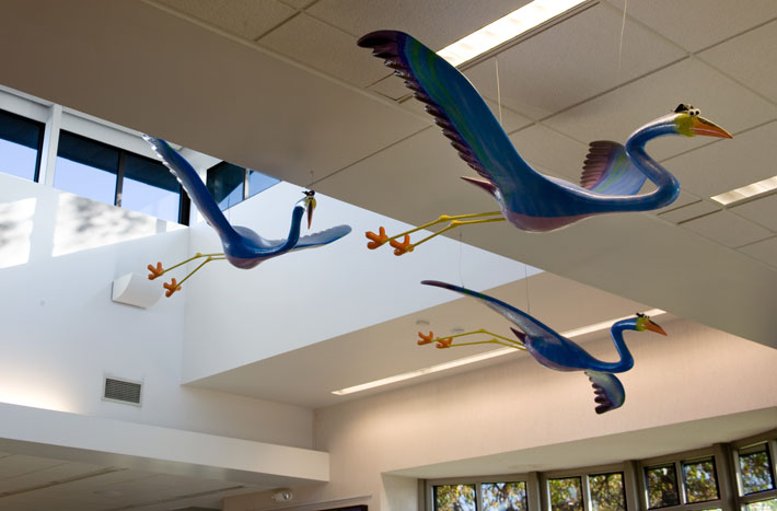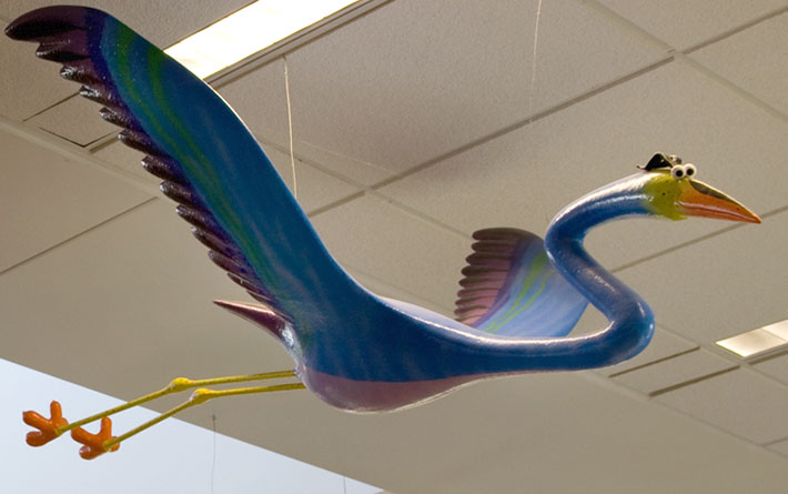 Herons take flight over the children’s area thanks to these sculptures by local artist Christopher Tully. The three blue-gray herons sport yellow legs and orange beaks as they move through different stages of flight, calling kids’ imaginations to take flight among the library books below.