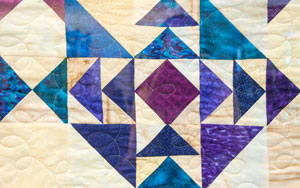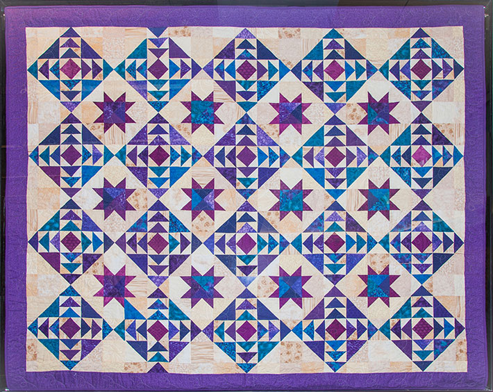 This quilt is intimately connected to the Champlin Library, considering its source: It was created by Ruth Stevens, who managed the library for 30 years, from 1956 to 1986. It’s the only quilt Stevens ever made in purples and blues—an aesthetic choice perhaps attuned to the library, which used those design colors at the time. Stevens’ family donated the quilt to the library in 2011.