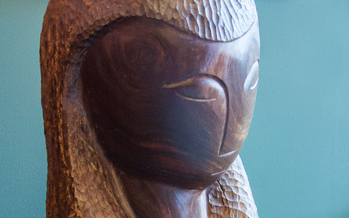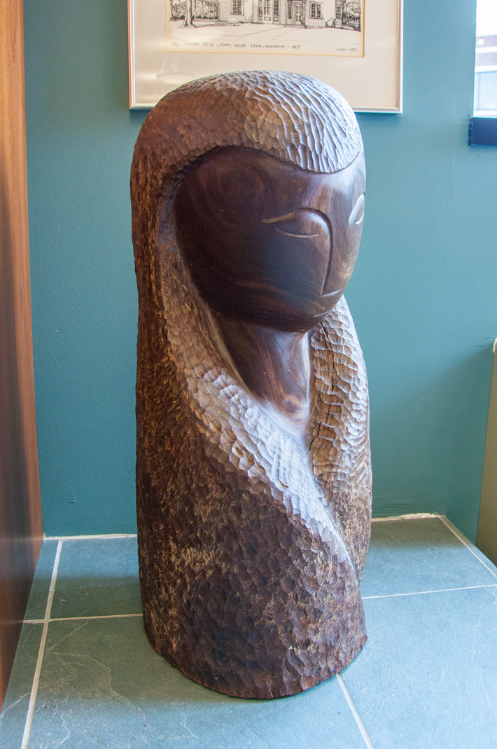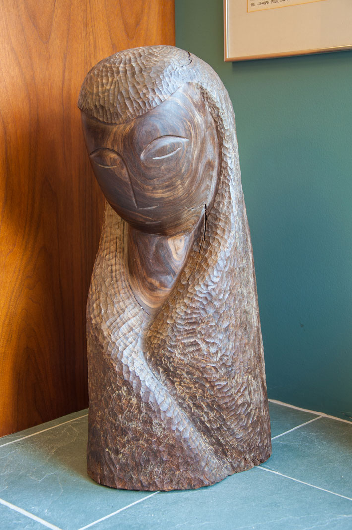 In 1968, the library showed a collection of artworks by Edina resident Dr. Robert Wilder, a mix of pieces in wood, stone, wire and metal. One of those sculptures, “De Madera,” ended up staying much longer than the rest. The library decided to purchase the sculpture of a head, and it’s been a library fixture ever since. Crafted from rich Mexican wood, it offers lovely contrast between the smooth, stark, graceful lines of the sculpture’s face and the tactile texture around it. “De Madera” was the first sculpture Dr. Wilder ever agreed to sell.