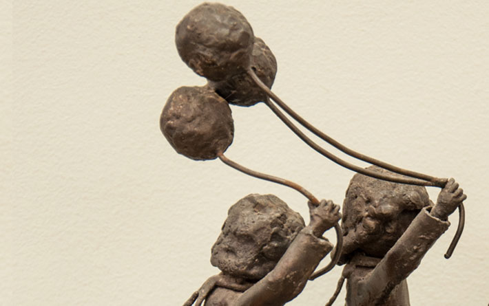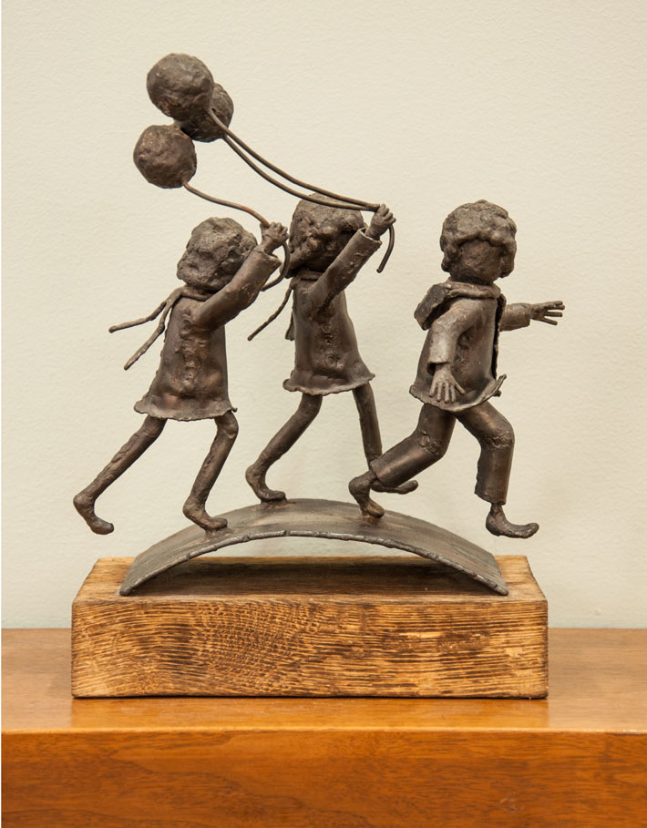 This sculpture summons the summertime feel of children on parade, carefree and off on an adventure. Three kids march spiritedly forward, with the two girls in the rear holding tightly to their balloons. Children at play appear in many of Wisconsin artist Tom Montemurro’s sculptures, along with more industrial themes such as cars and machinery.