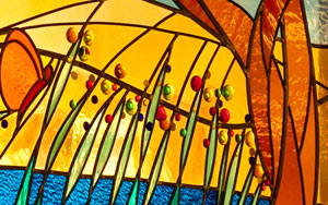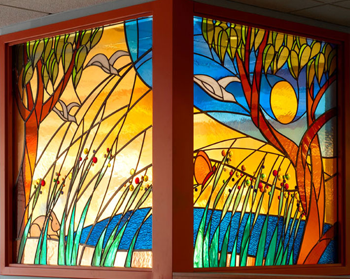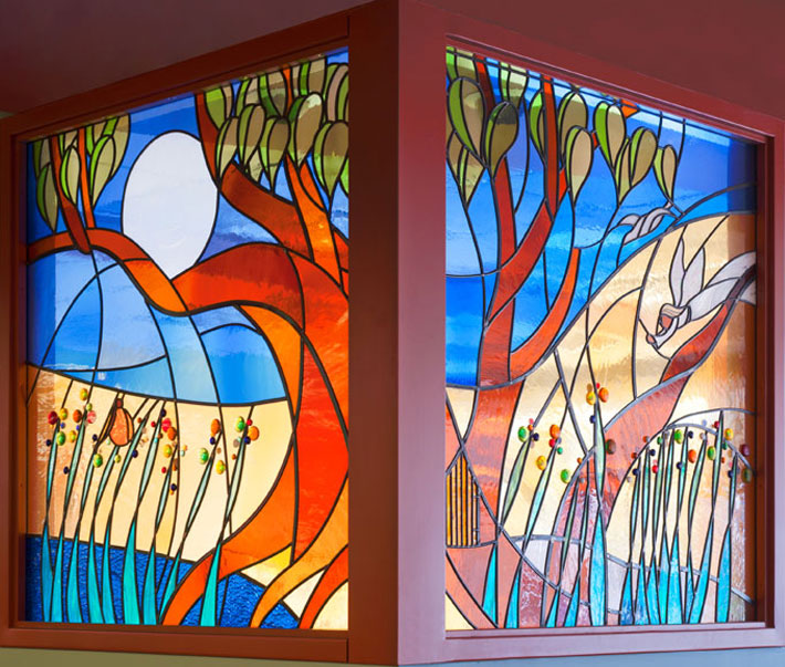 This brilliantly colored nature scene brings a bit of the outdoors into the library, with its tall tree of knowledge, colorful flowers, birds, and beautiful blue skies and waters. Local artist William Saltzman added a few whimsical touches to the windows as well, including a fairy in flight and a small elf door. The serene scene and softly curving lines are intended to help balance out the more angular design of the building itself, providing an oasis of calm in the midst of the bustling library.