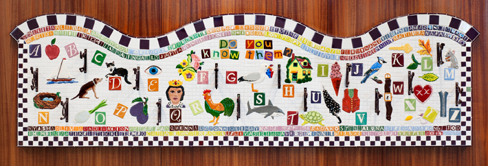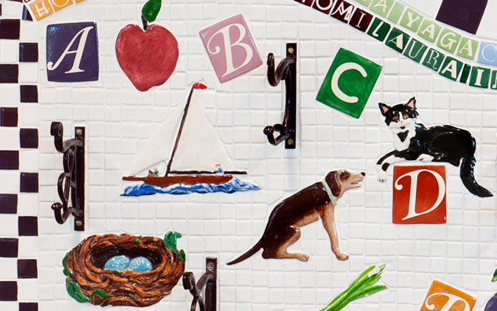 This colorful coat rack is at once a work of art, a functional furniture piece and a learning opportunity. A mosaic made of ceramic tile, it asks visitors, “Do you know them?” and then highlights letters of the alphabet with associated images to spark children’s imaginations. A colorful border adds another playful layer, with letter tiles spelling out the names of characters from children’s literature.