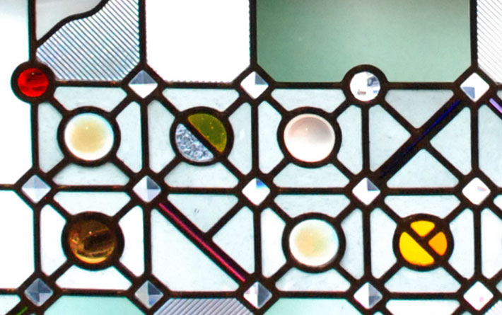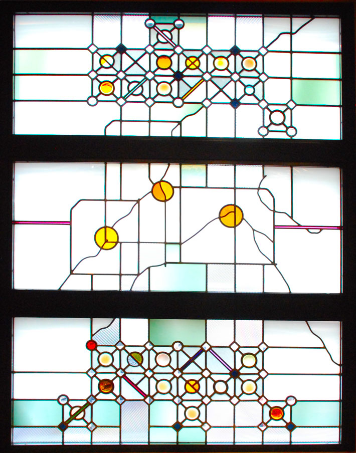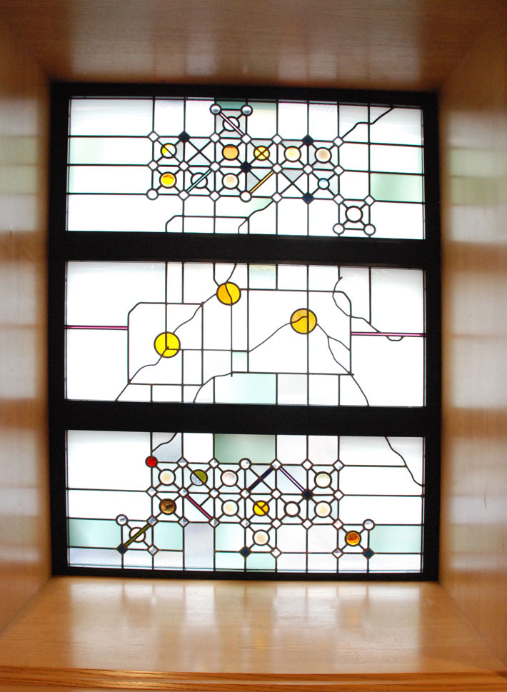 The artist uses his signature stained glass medium to illuminate the library while offering reflections on the experiences within it. “Books,” in soothing blues, meditates on the library’s best-known resource, while “Cosm” and “Ovum” use warmer colors to symbolize the new life found in knowledge. The artist’s work is also featured at Hosmer Library in Minneapolis, and he has been a key figure in glass restoration projects around the Twin Cities.