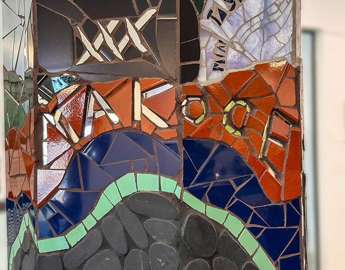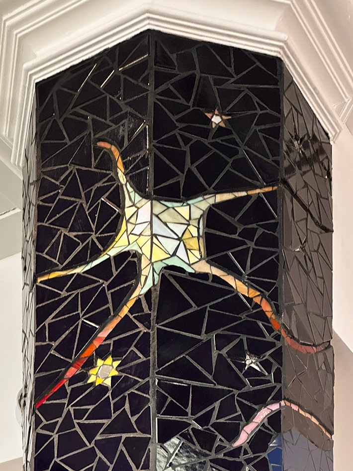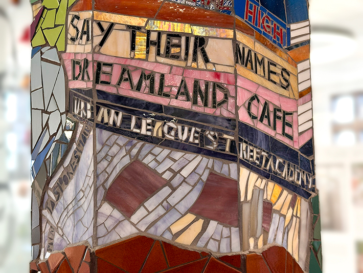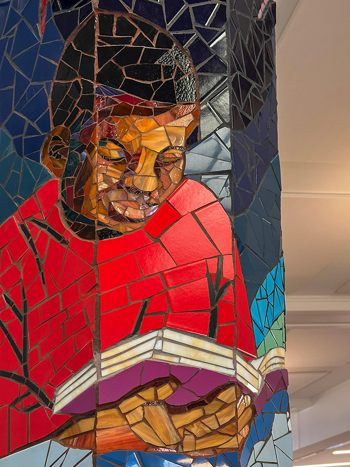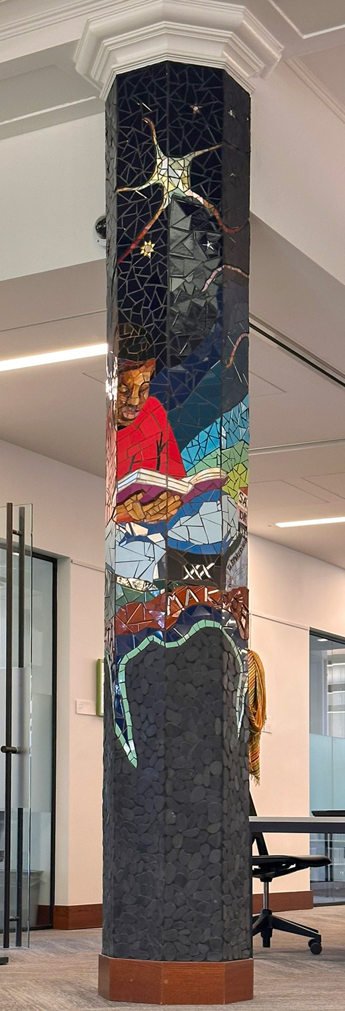 The east pillar features a child reading. The child is seated on the earth. The Dakota words Mni Sota Makoce are woven through the indigenous soil. Each book and newspaper stacked beside the child honor important community institutions and movements core to the Central Neighborhood. As the child learns about their history, waves of energy radiate into the cosmos. The stars become neurons, representing learning, and the vast beauty of neurodiversity.