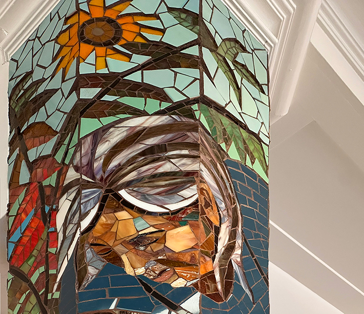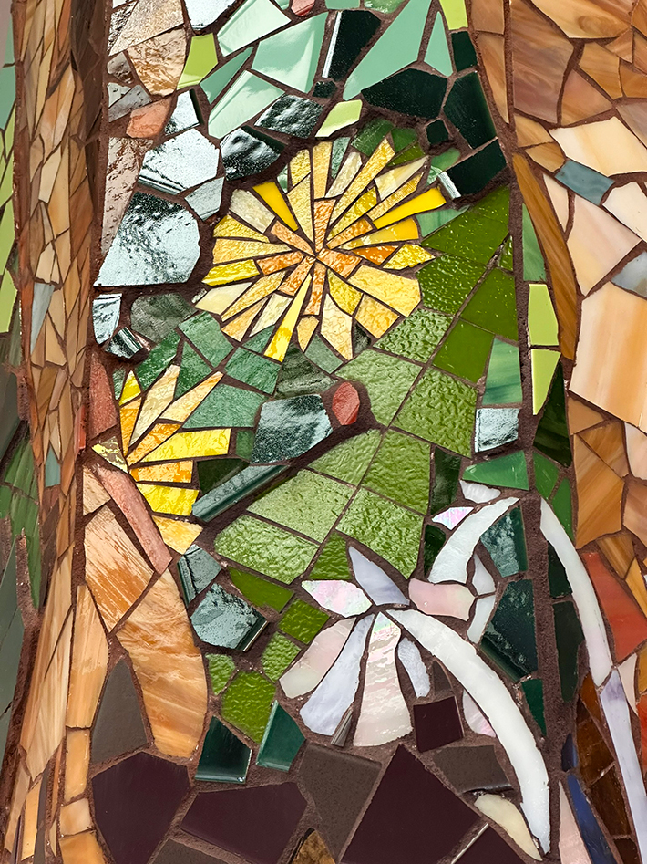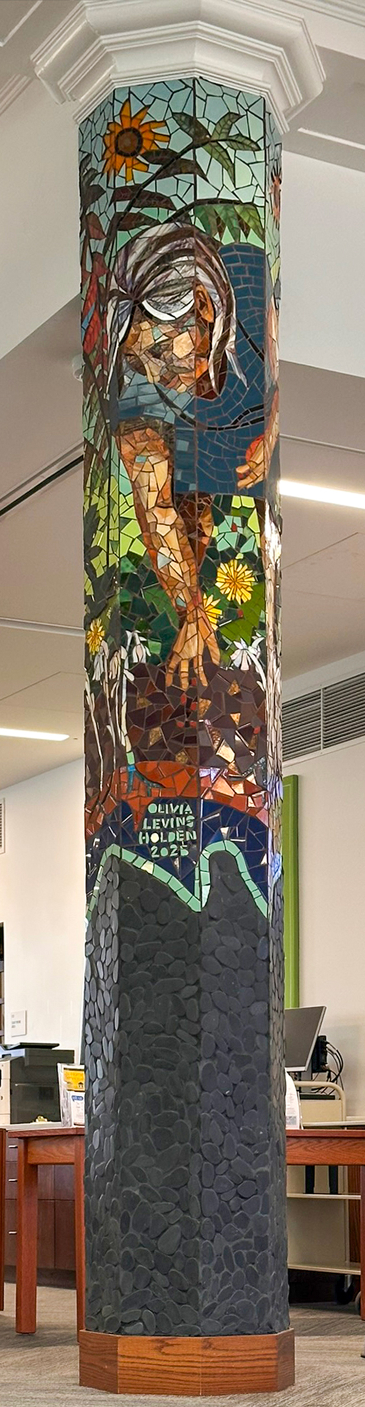 The west pillar features an elder gardening, surrounded by an ecosystem of native plants. She is planting seeds for future harvest and pollination. This pillar honors the long history of foraging, cultivating, community gardening, and diversity in the Central Neighborhood.