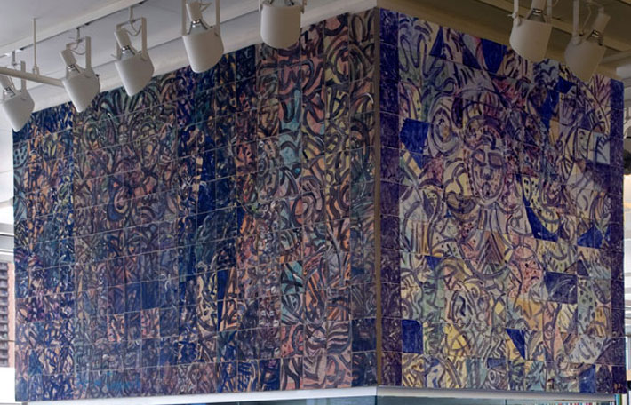 “The Power Of …” invites viewers to pause and reflect for a while, finding their own answer to this artwork’s unfinished title. There’s a lot to see within the richly colored ceramic mosaic, which wraps around the fourth-floor fireplace. A grandparent figure anchors one end, serving as the holder and transmitter of stories, and around this figure swirl the interwoven stories, memories and energies of the evolving human spirit.