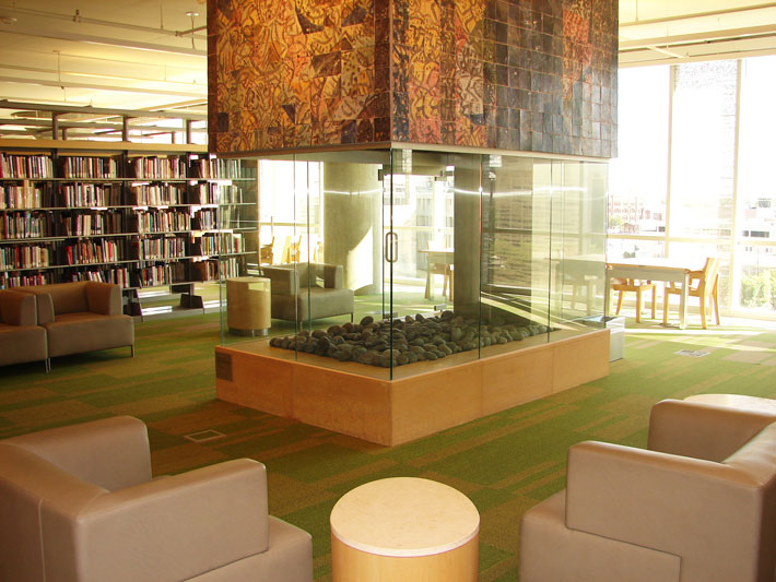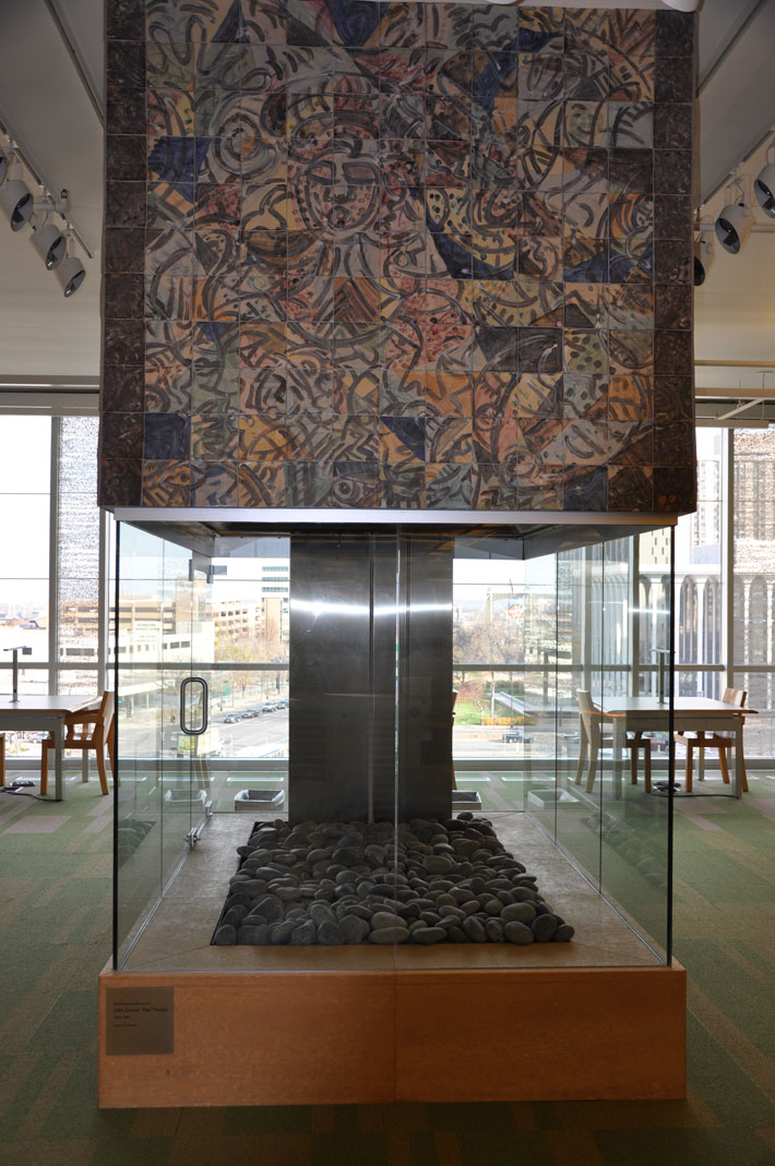 “The Central Library fireplace commission reflects the spirit of inquiry and discovery. My intent is to create a quilt-like design that encompasses the many aspects, energies and spirits that make us who we are. I show the many layers of imagery that inspire us to ask questions and to make decisions.”