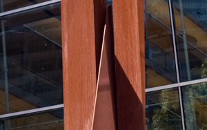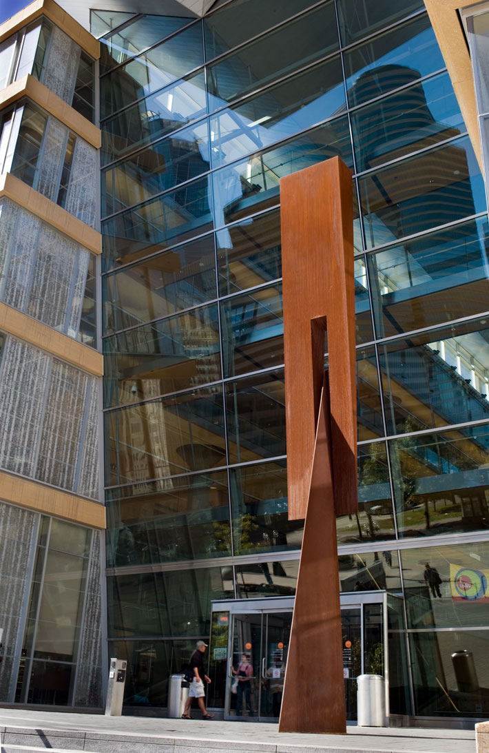 “The sculpture’s pyramidal blade-shaped base element echoes the shape of the roof that overhangs the Nicollet Mall, while the sculpture’s upper wedge echoes the forward tilting shape of the main entry curtain wall. … It was my intention to create a dynamic sculptural event through the visual integration of the building’s principal character-defining elements.”