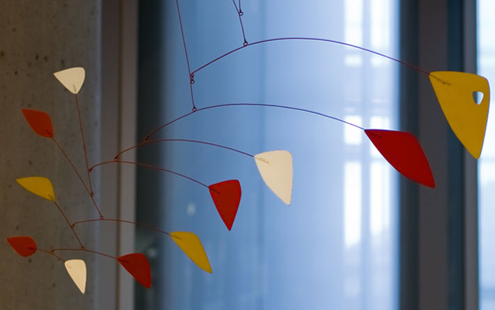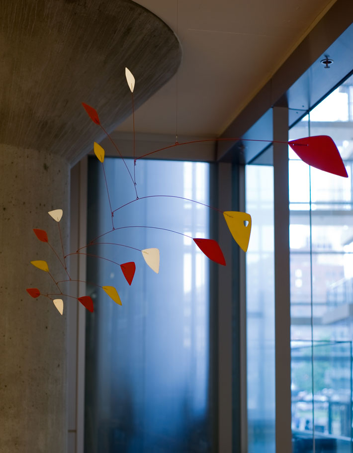 This is one of the more historically significant pieces at the library—a mobile from the man who invented the mobile. Alexander Calder was a well-known artist and engineer in his day, making a name for himself in the Parisian art scene with his kinetic sculptures, which Marcel Duchamp dubbed “mobiles.” Calder’s works were known for their primary colors, and that characteristic effect is on display here. This mobile features 15 triangular metal pieces in red, yellow and white, connected by red steel wire rods and all delicately hung from the ceiling by one little wire.