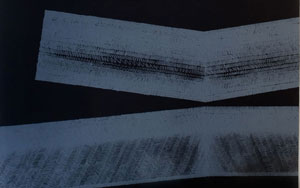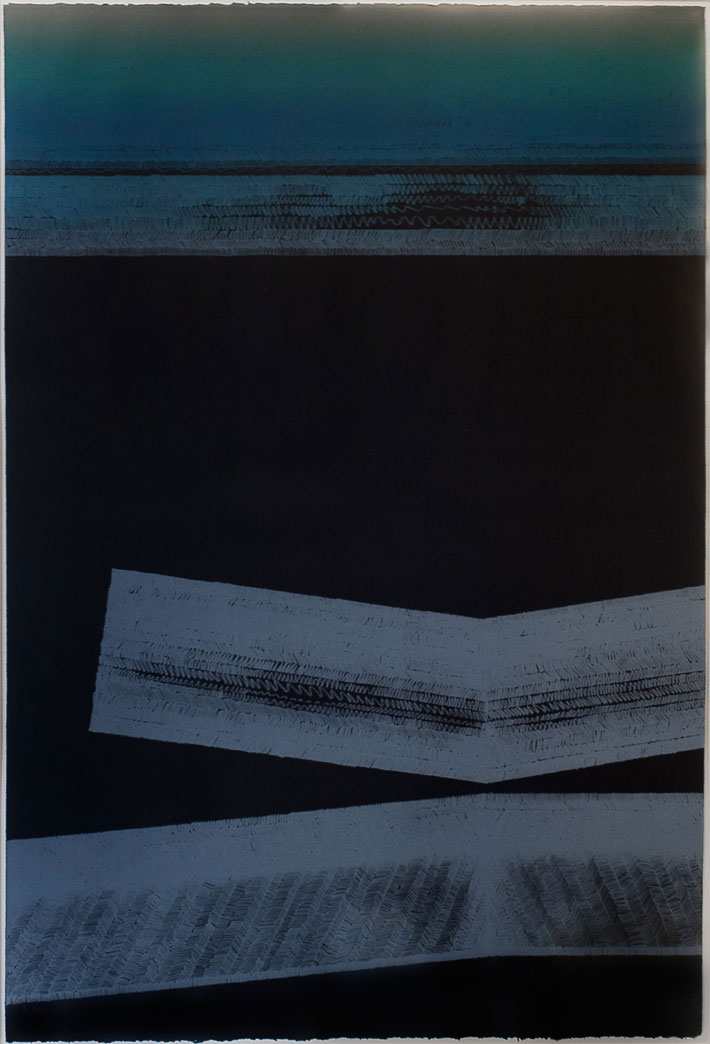 Fine-art press Vermillion Editions Limited launched in Minneapolis in 1977 and ran till 1992, publishing works by the likes of Robert Mapplethorpe and William Wegman. In that tenure, it also produced the Portfolio 15 series, commissioned by Northwestern National Bank and displayed as an exhibition of Minnesota artists in 1978. One of those artists was Mary Griep, who created this abstract print as number 13 of the series. Her dark composition includes bands of color running across the top and bottom, their trajectories marked with intriguing tire-track textures.