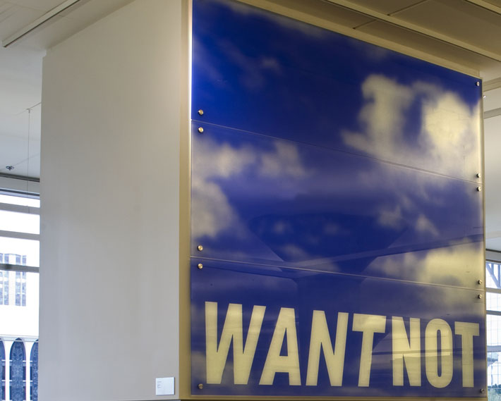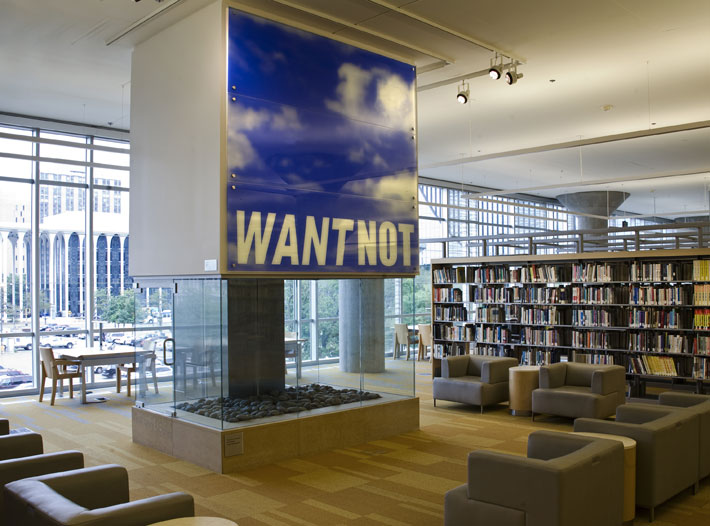 One of four fireplace-art commissions in the library, Jackie Chang’s work takes inspiration from the Dakota word “Mnisota,” or “sky-tinted waters.” To create this blue-sky scene, she chose to work with architectural float glass and colored metal oxides, which got melted on at Franz Mayer Studio in Munich. The words “WANT NOT” stand tall at the bottom of the expansive sky, offering visitors the opportunity to discover their own interpretation. Each panel features a mix of semi-opaque and transparent areas, offering moments of immersion and moments of clarity.