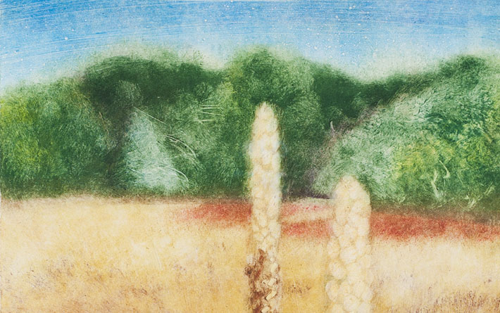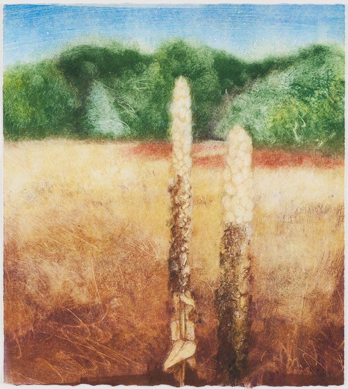 Monotypes tend to be one-of-a-kind pieces of art, with no two exactly alike. To start, the artist paints or draws on a plate (historically a copper etching plate, but today it might be zinc, glass or acrylic) and then transfers the image onto paper through a pressing. Much of the ink gets removed in that first pressing, making subsequent pressings (if they’re done) slightly different. It’s a method used by local artist Gwen Partin, whose work usually highlights nature themes: flowers, birds, landscapes. For this 10-by-11-inch monotype print at the library, she focuses in on mullein, a Minnesota plant often used in herbal medicine.