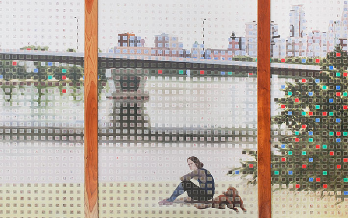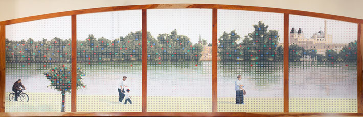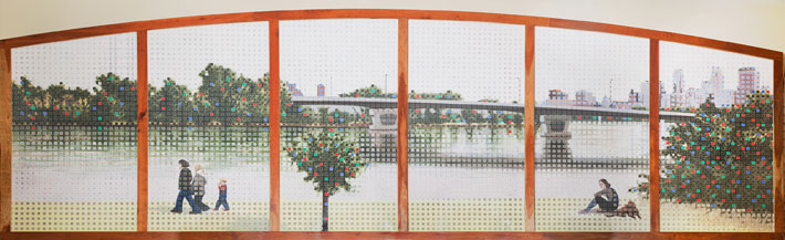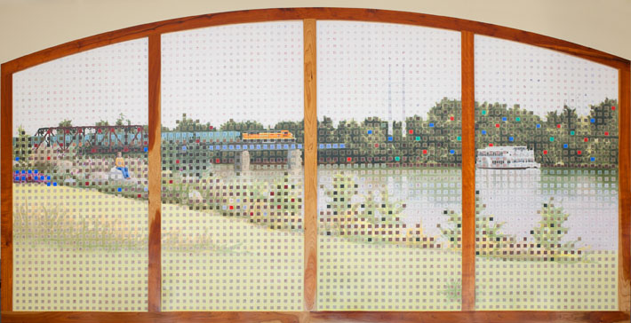 In this massive mural of the Mississippi River, the water serves to connect. In a more literal sense, the artwork connects library visitors to the great river flowing just blocks away. Metaphorically, it connects the viewer to the river of knowledge available within the library. Local artist Rollin Alm created the piece with 15 paper panels, painting them with watercolor to align with the feel of water flowing. The resulting 60-foot river scene was framed in cherry wood, covered with Plexiglas, and intentionally hung to run parallel to the Mississippi. Alm also created one other offering for the library’s opening in 2003: He curated a local art show, several pieces from which still hang on the library’s walls.