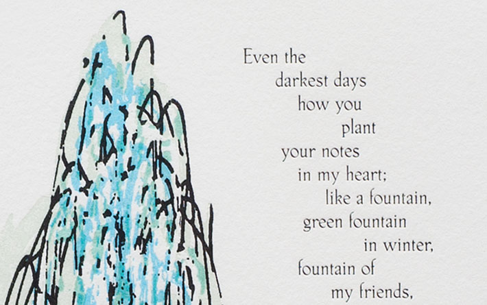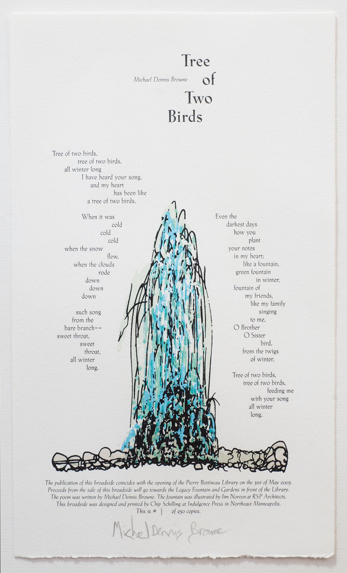 When it came out in 2003, this broadside marked a notable moment in time: the opening of the current library in the old Grain Belt Building. The broadside functioned not just as art, but as a fundraiser, with proceeds from its sale benefiting a community effort to replicate the old fountain and gardens at the corner of Broadway and Marshall. Jim Noreen of RSP Architects illustrated the fountain for the broadside, which also featured the poem “Tree of Two Birds” by Michael Dennis Browne, all artistically designed and printed by W.H. Schilling of Indulgence Press.
