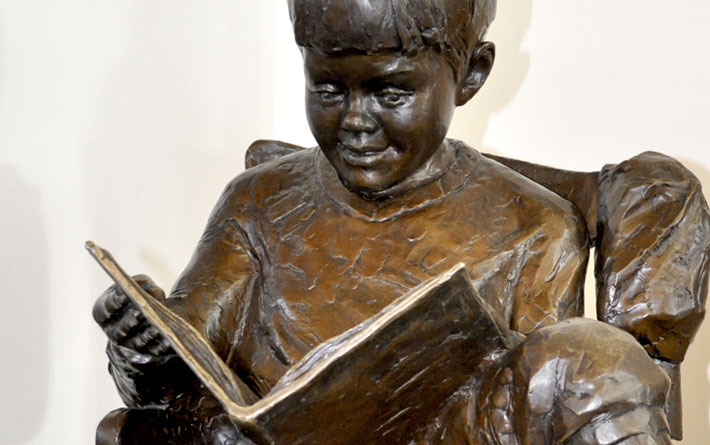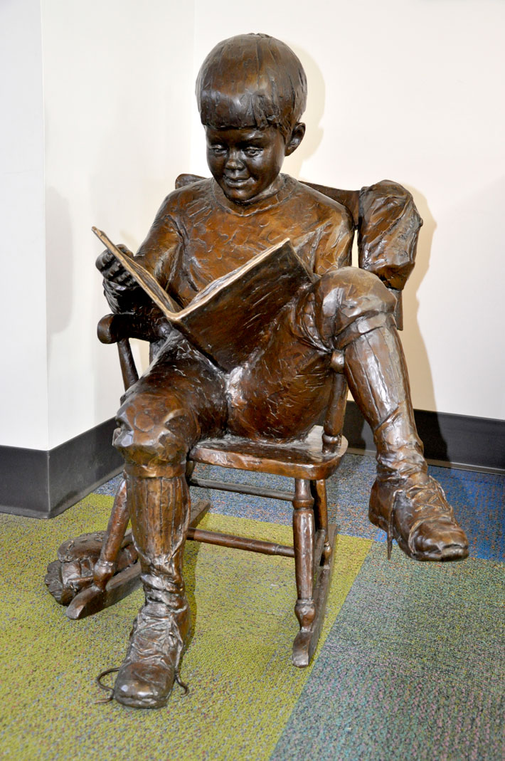 Meet Charlie Read, who first came to the Plymouth Library in 1999. The bronze sculpture by Utah artist Gary Lee Price was originally called “Time Out Boy,” but Plymouth Library’s community of children helped rechristen him, with a naming contest sponsored by the Friends of the Plymouth Library. The sweet bronze sculpture shows a young mind completely enraptured in the world of books and learning.