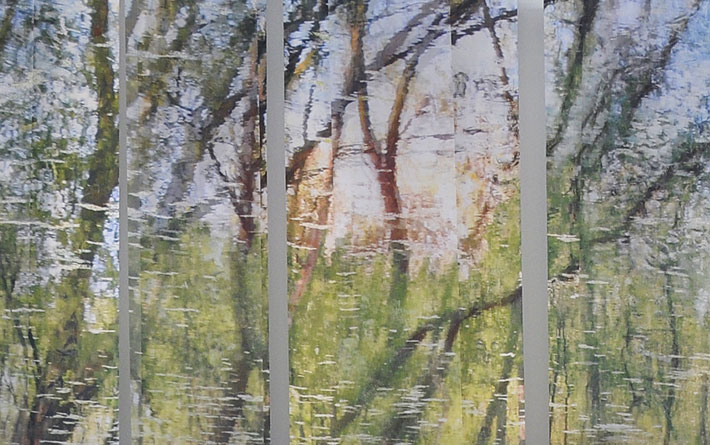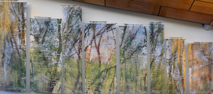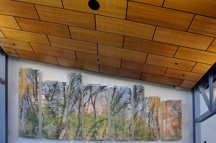 This fabric mural hanging 30 feet high on the library wall is deeply connected to its location, reflecting the look of nearby Mooney Lake in early spring. Local artist Joan Solomon used 14 fabric scrolls (made from completely recycled fabrics) to create this 20-foot-wide piece that ripples in the air, echoing the gentle movement of those nearby waters.