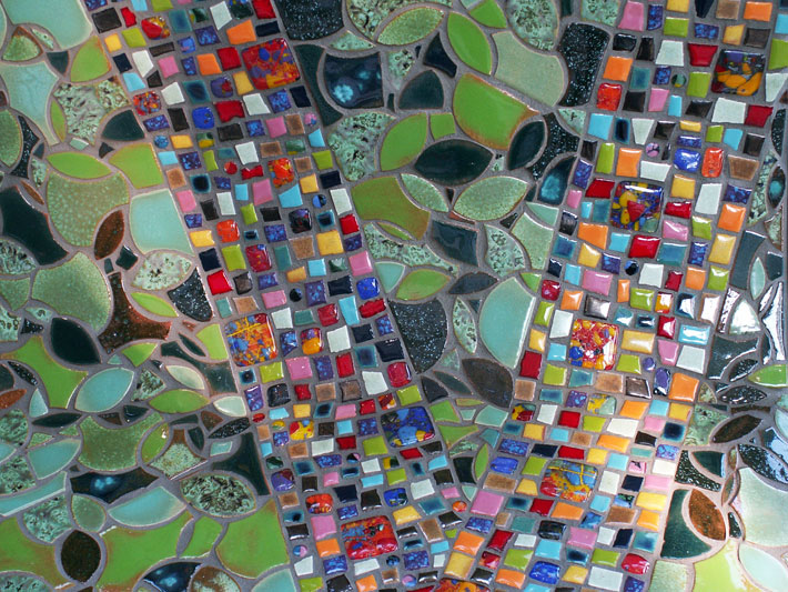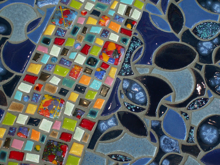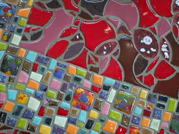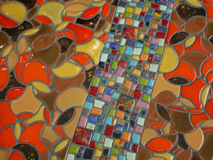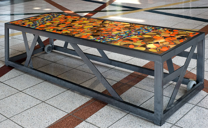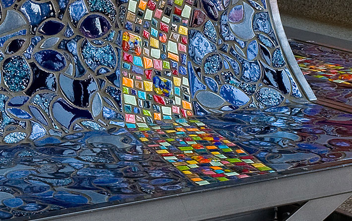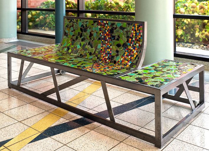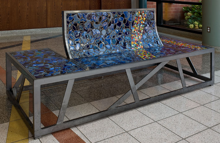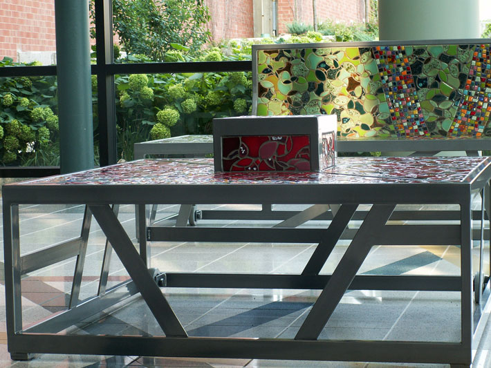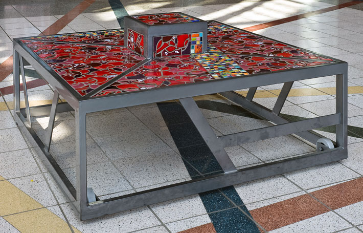 Part of the entryway ensemble and conceived as four unique pieces, each bench is constructed as a steel framework inlaid with color and line. Corresponding to the bands of color in the floor below, each bench has a band of brightly colored ceramic and glass tile, suggesting the paths of people, information and ideas into the library.