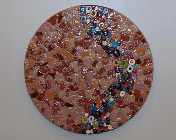 Two circular mosaics invite contemplation and reflection within library spaces, as the eye follows the winding “river” of multicolor stamped circles. Displayed in the Roosevelt meeting room, these pieces are the backdrop of every library event and community meeting, fitting for Tuorila’s flowing designs that evoke the connectedness of life.