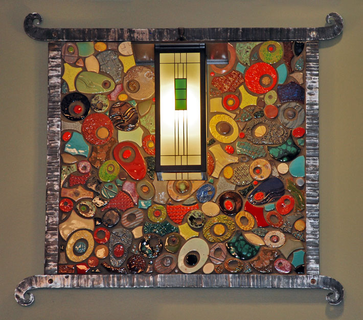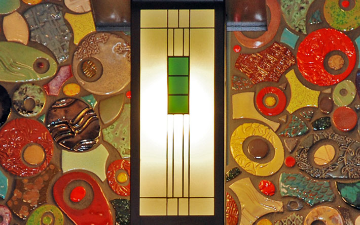 Throughout the library, you’ll find seven mosaic sconces with hand-forged iron frames. In Tuorila’s creative process, individual tiles were cut, glazed and fired in the kiln before each piece was mindfully selected for the mosaics. Different colors and textures are illuminated by the sconces, casting light – and inspiration – on library patrons nearby.