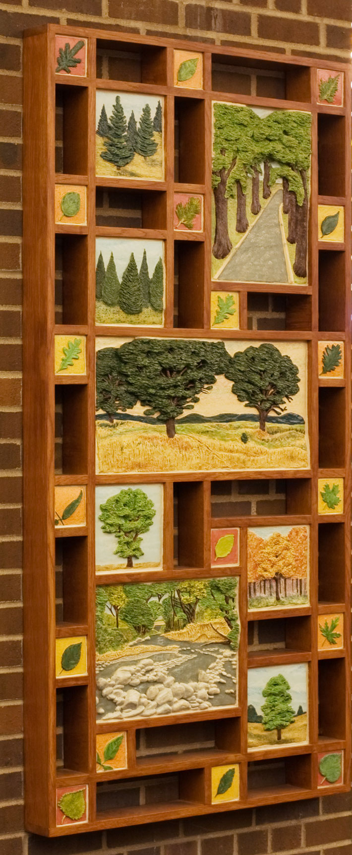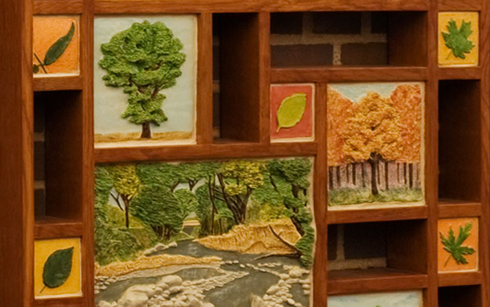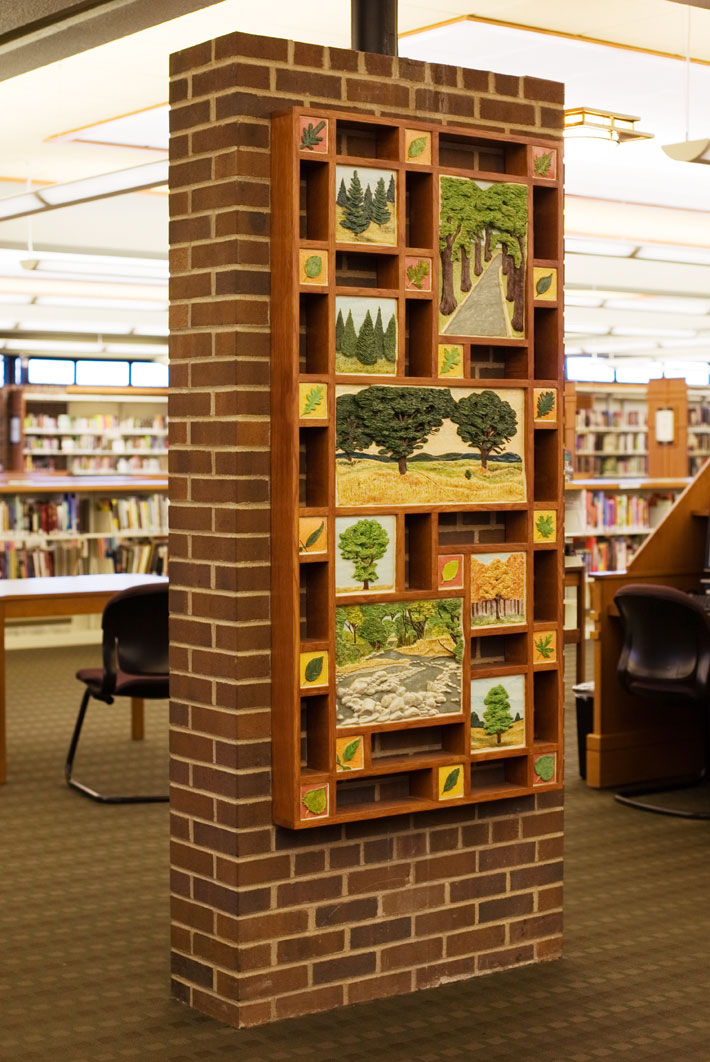 When the remodeled St. Louis Park Library opened in 2002, an exposed brick pillar presented a great blank slate for art. The library wanted the piece to fit the architectural style of the building and connect to the location, and local artist Denise S. Tennen delivered on both fronts. An architect by training and sculptor by trade, Tennen’s art installation echoes the library’s Prairie School architecture, with ceramic tiles patterned into a geometric oak grid. Meanwhile, the images of trees and leaves honor the landscapes of Minnesota, from the oak savanna that the first settlers saw to the dense trees of the Big Woods to the tree-lined waters of Minnehaha Creek.