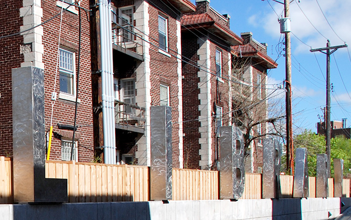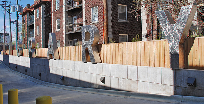 Running along Hennepin Avenue, these seven-foot brushed stainless steel letters became the most visible emblem of the previous Walker Library, opened in 1981, as its two main floors were built underground. Installed during a 1995 renovation to make the library more inviting, the letters were saved during the 2013 demolition to be relocated to the new library, opened in 2014. Now along the west side of the building and visible from reading loft windows, the letters welcome library visitors arriving by car, while pedestrians and cyclists on the nearby Midtown Greenway can sneak a peek from The Mall.