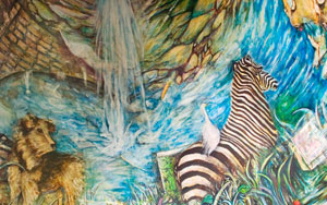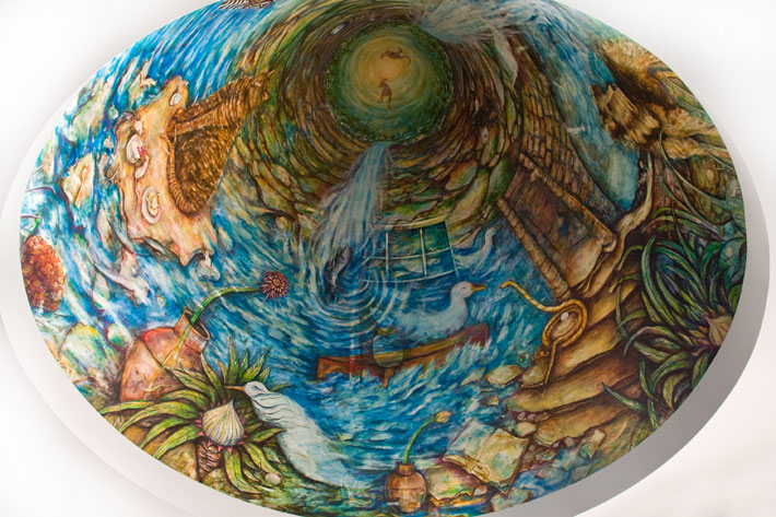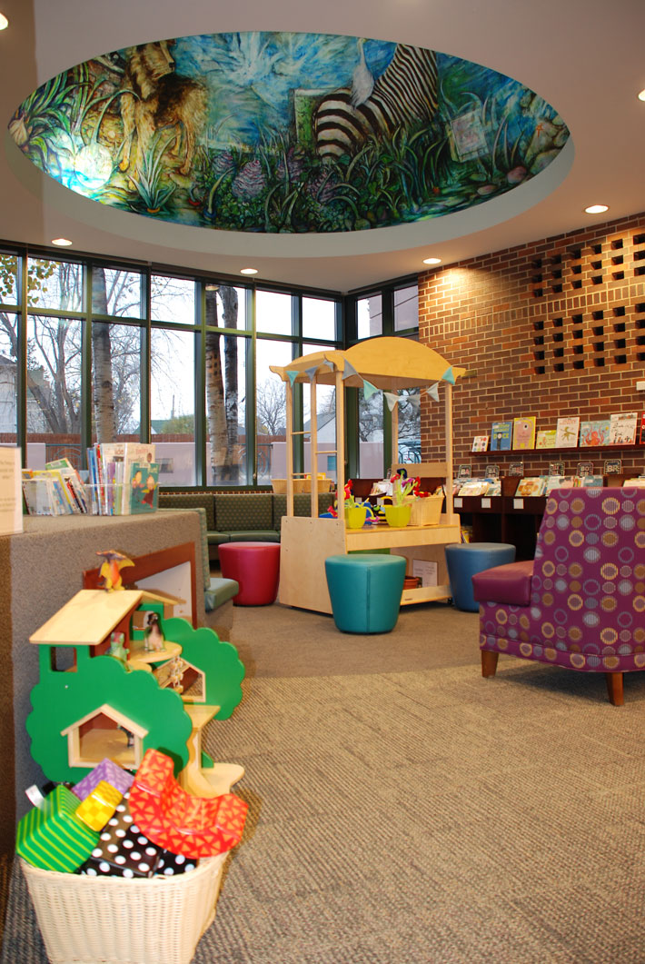 Tucked into the dome above the children’s area is a whole imaginary world where whimsical animals interact. The best way to view it is to lie on your back in the middle of the children’s area and turn your gaze upward. From there, you can see the painted waterfall (inspired by nearby Minnehaha Creek) cascading down, and you’ll spy a variety of creatures: dancing kangaroos, a dog, mice enjoying cheesecake and tea, all created by Virginia Bradley for the kids (and adults) of Washburn Library.