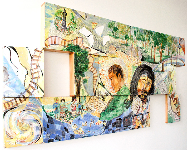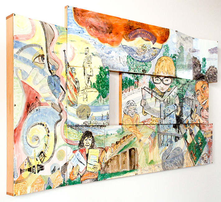 Welcoming visitors in both the north and south vestibules of the library is a collaborative mural, composed of layers of enamel tiles. Coated, fired, painted and fired again, this layering process reflects the many voices and stories the artists heard from community members. The dynamic mosaic invites viewing from multiple angles and perspectives throughout the day, as the light illuminates new details within recurring motifs, such as the river. Swirling and transforming, the river reflects changing narratives and the cultural wave of the community.